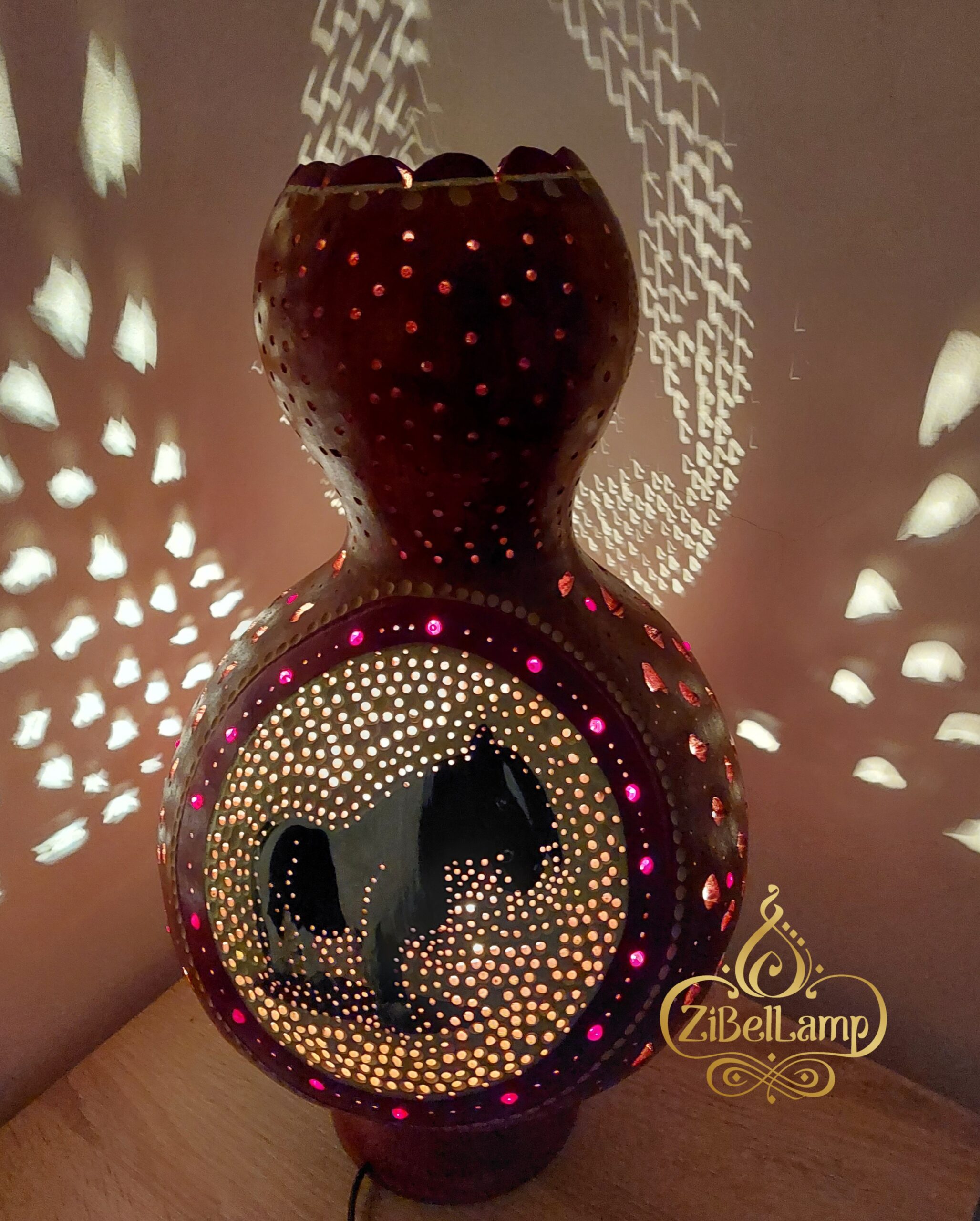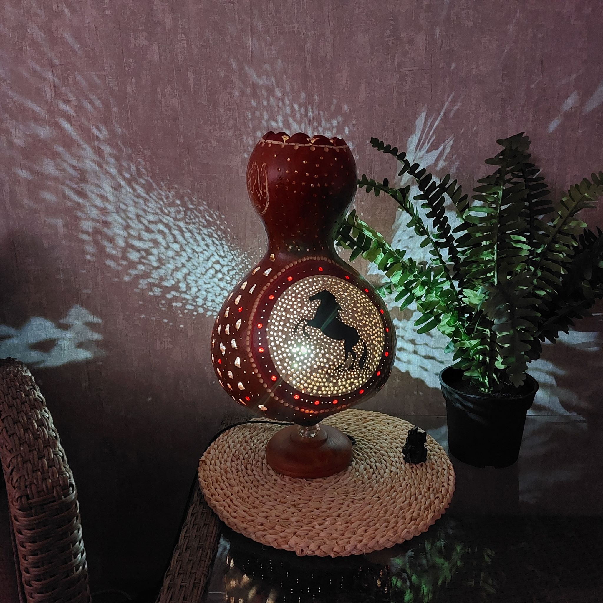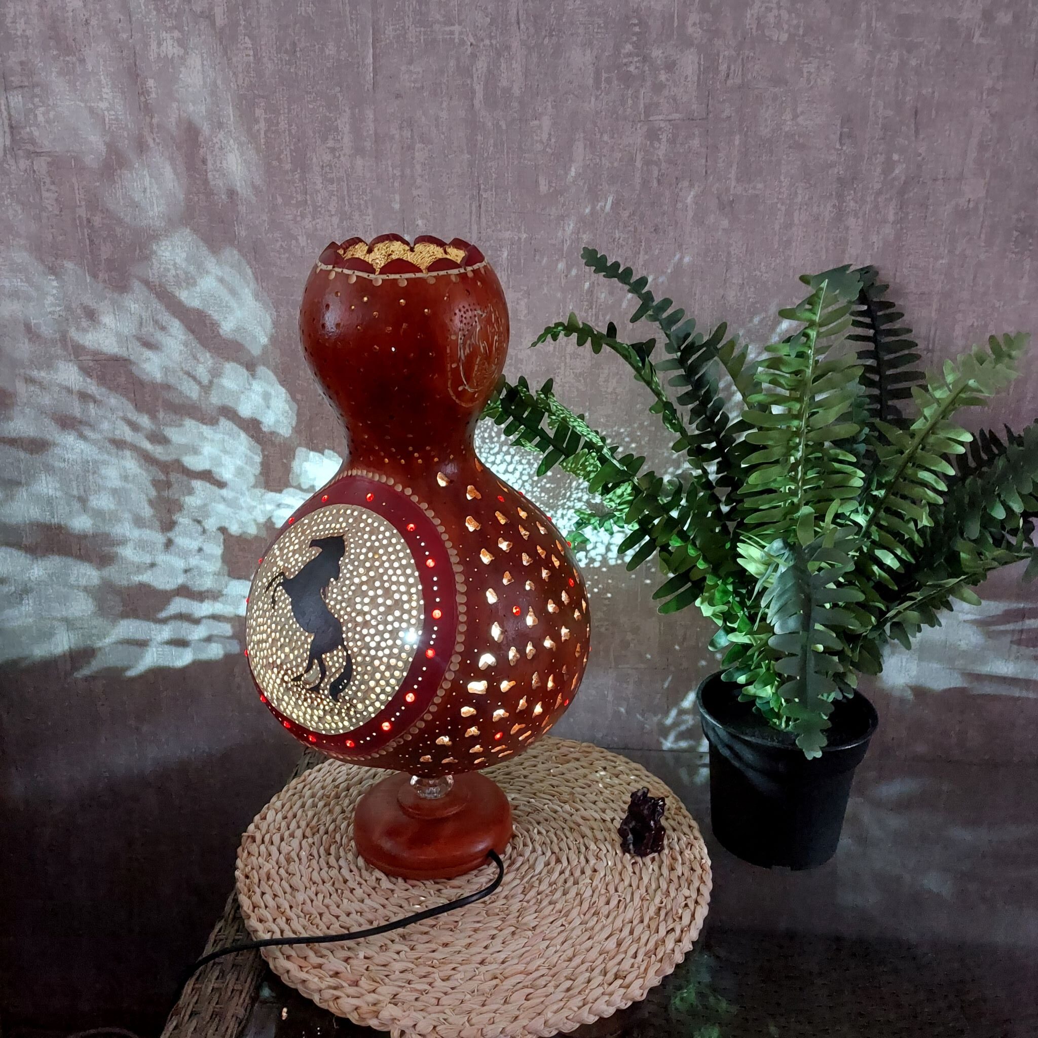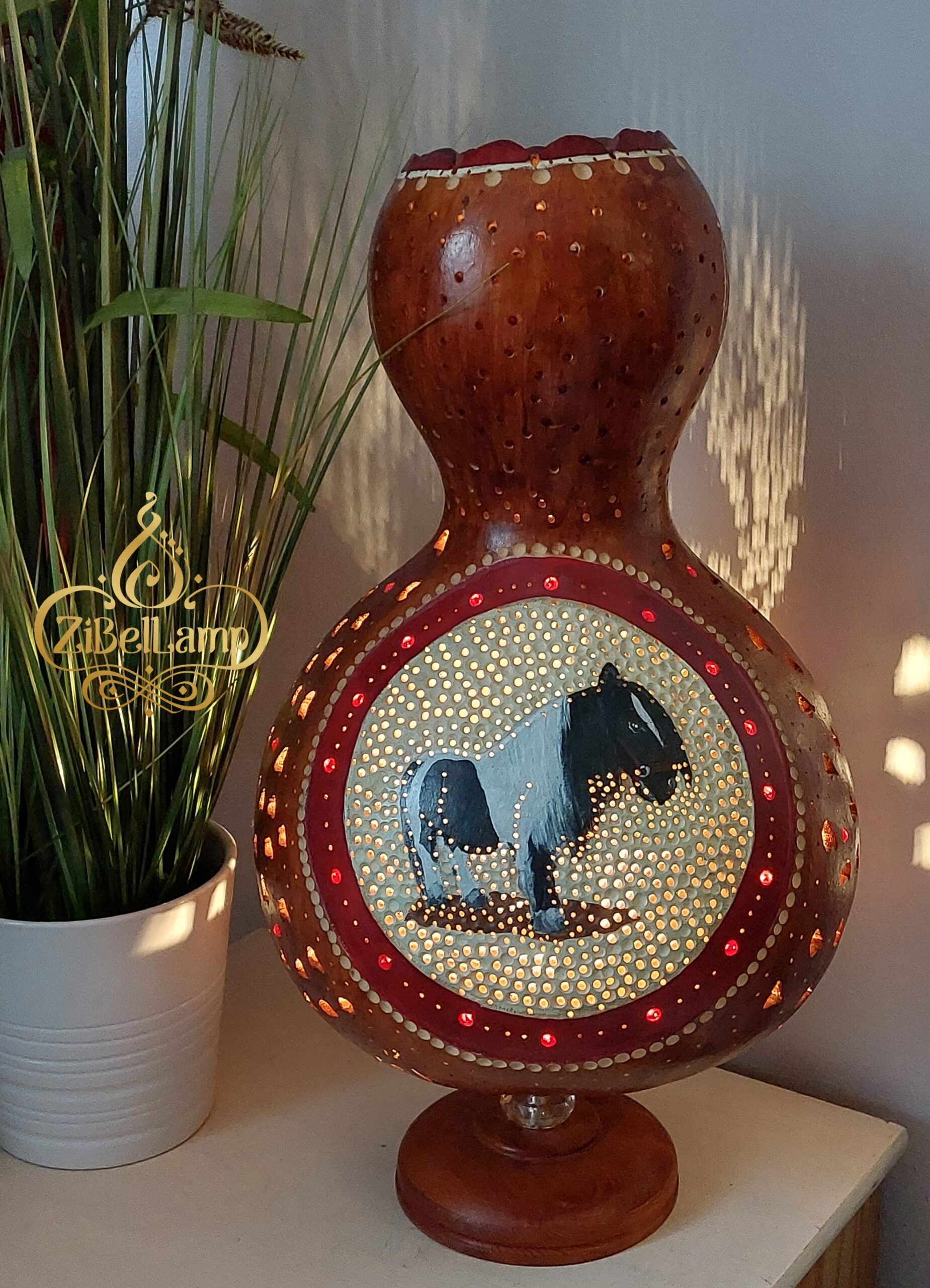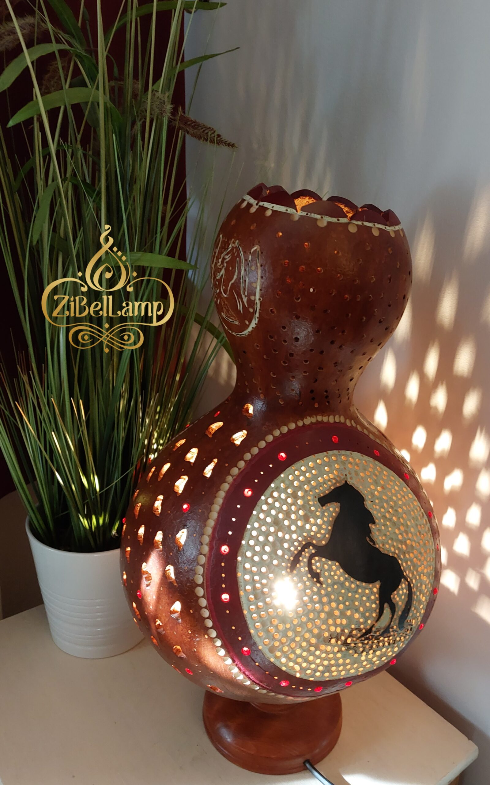 Ez az óriás méretű lámpás, természetes alapanyagból, szárított lopótökből készült. Rengeteg munka és idő van benne. Természetes színvilág, forma és aprólékos ua. diszkrét motívumok és díszítések jellemzik, melyek a lovas világot képviselik. Maga a lámpás két oldalán egy ágaskodó ló a másikon pedig egy póni képe látható. Fúrás, vágás, vésés, marás, jellemzi finom festéssel és diszkrét gyöngyözéssel. Fénye csodálatosan bevilágítja környezetét. Gyönyörű ajándék lehet a lovakat kedvelőknek.